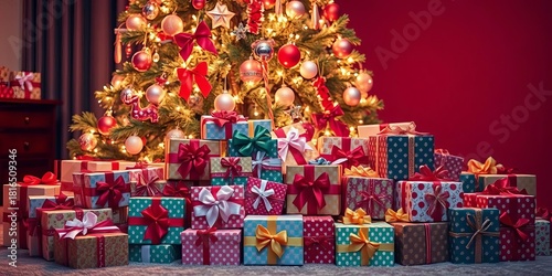 © Chavanlak, Naklejka premium Pile of wrapped gifts under twinkling Christmas tree, festive bows, boxes, holiday