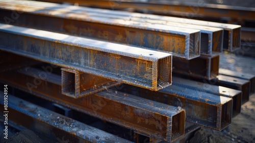 Obraz premium Piles of steel beams and columns at a construction site, ready for assembly in building structures.