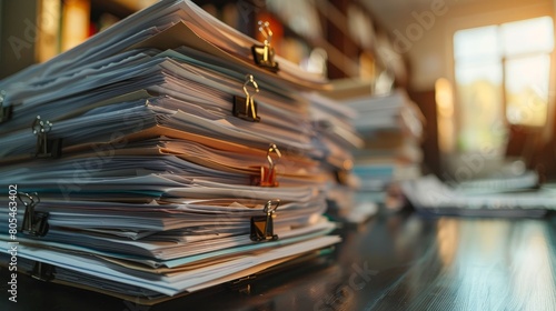 © Media Srock, Obraz premium Piles of unfinished documents archives with clips