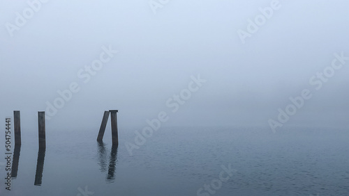 © Gioia, Fototapeta premium piles sticking out of the water in foggy evening nature landscape