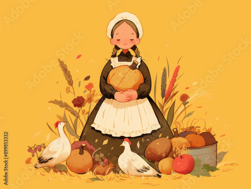 Obraz premium Pilgrim girl holding a pumpkin surrounded by harvest decorations