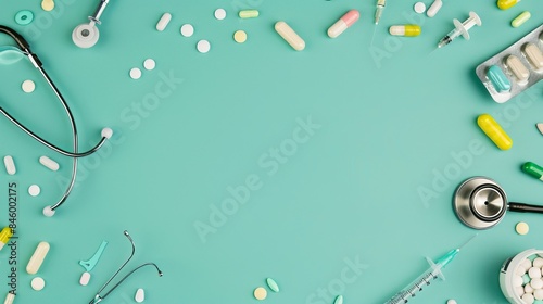 Fototapeta premium Pills and medical equipment, including a stethoscope, syringe, and scissors arranged at the border on a green banner background. Top view with ample copy space.
