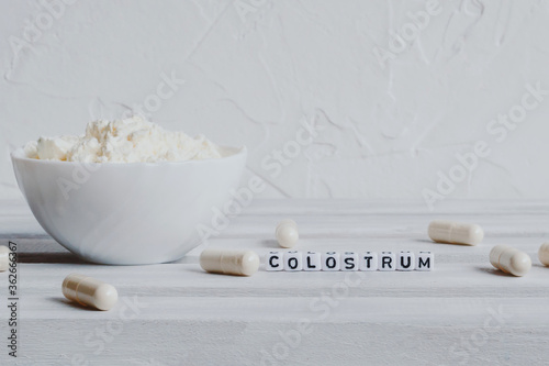 Fototapeta premium Pills capsules with colostrum, on a white background
