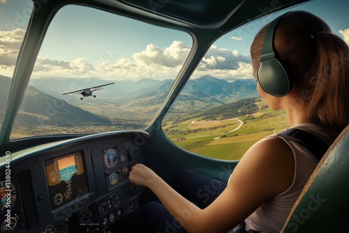 © YouraPechkin, Fototapeta premium Pilot navigating a small aircraft over scenic mountain landscape during daytime
