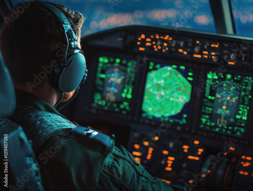 © Nittaya, Obraz premium Pilot navigating airplane cockpit at night with focus and precision