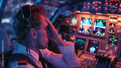 Fototapeta premium Pilot sitting in cockpit, looking frustrated and holding head, surrounded by flight instruments and control panels, capturing stress and responsibility in aviation, pilot error concept.
