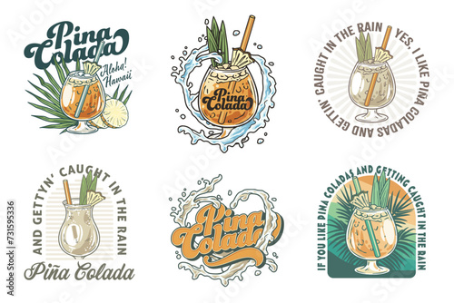 © Casoalfonso, Naklejka premium Pina Colada cocktail tee print vector set with splashes and slice of pineapple for cocktail bar or drink summer party. Pina alcohol cocktail collection lettering with rum for beach bar and cafe menu