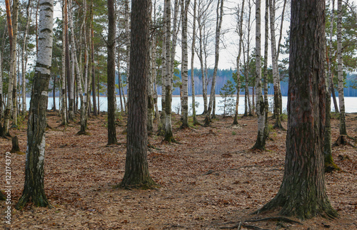 © RomanovRV, Obraz premium Pine and birch shore of a frozen lake