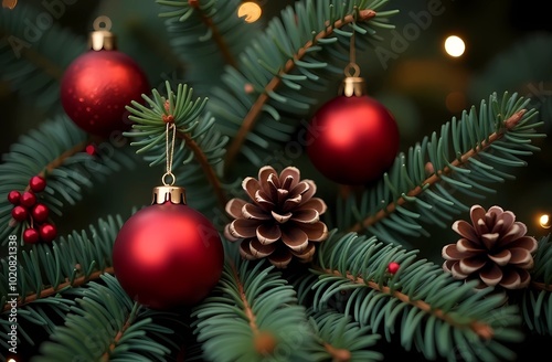© Ana River, Fototapeta premium Pine branch with Christmas toys. Holiday mood