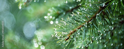© iVGraphic, Fototapeta premium Pine branch with dew droplets in focus, close-up shot. Nature and freshness concept