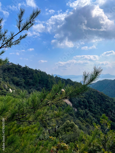 © Anna Baranova, Obraz premium Pine branch with mountain view and cloudy sky.