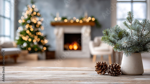 © Irina Sharnina, Fototapeta premium Pine branches in vase and cones on wooden table on blurred background with cozy living room decorated with Christmas tree, burning fireplace. Winter holidays background