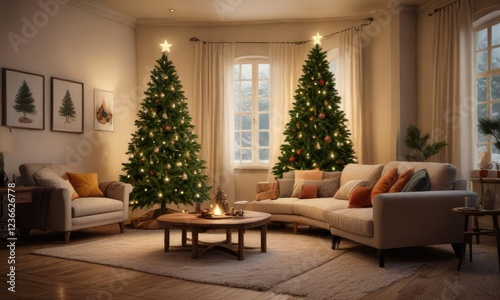 © Janmo, Fototapeta premium Pine Christmas tree in a cozy living room with warm lighting and comfortable furniture, warm lighting, festive atmosphere