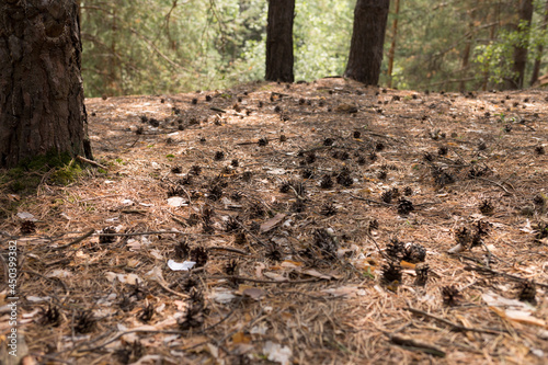 © Elena, Obraz premium pine cone laying down in the forest below the tree