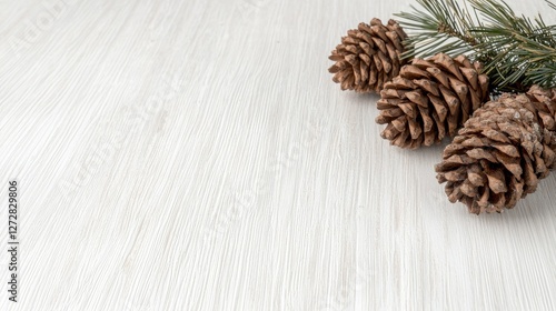 © danadesa, Fototapeta premium Pine cones on a white wooden surface
