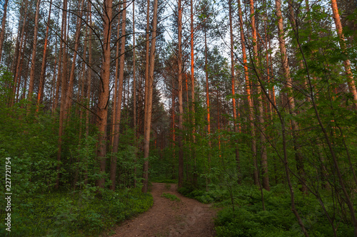 © WladiM, Obraz premium Pine forest at dusk at sunset