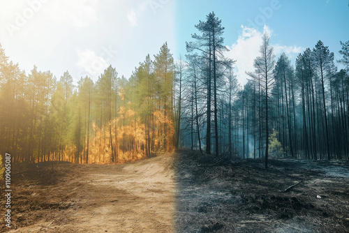 © Zaifa Art Mart, Obraz premium Pine forest before and after the fire