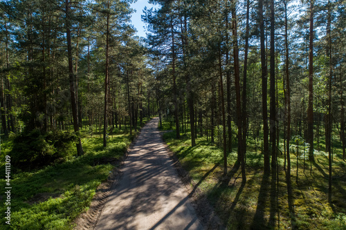 Obraz premium Pine forest, birch trees, mixed forest and the sun showing through the trees...