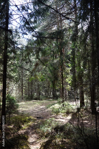 Fototapeta premium Pine forest. Depths of a forest. Journey through forest paths. T