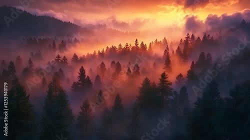 © Jannatul, Naklejka premium Pine Forest Enveloped in Fog During Peaceful Sunrise