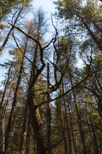 Obraz premium Pine forest environment lit by sun rays. Play of light, shadows and green color.