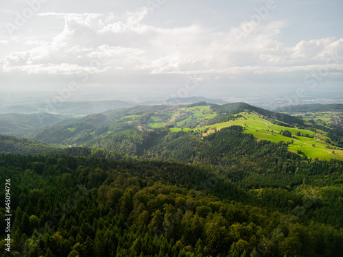 © Kateryna Muzhevska, Obraz premium pine forest in mountains covered with fog after rain, green forest, summer, drone flight