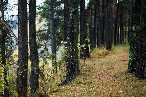 Obraz premium Pine forest in rainy autumn morning. Autumn landscape.