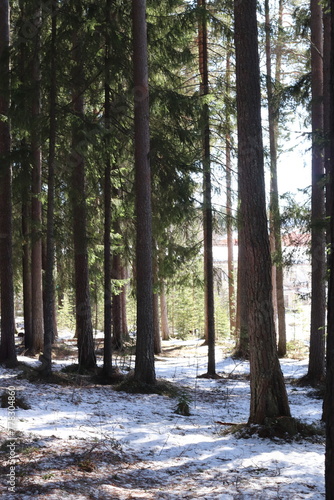 © Svetlana, Obraz premium Pine forest in Scandinavia on a sunny winter day. Snow and pine trees.