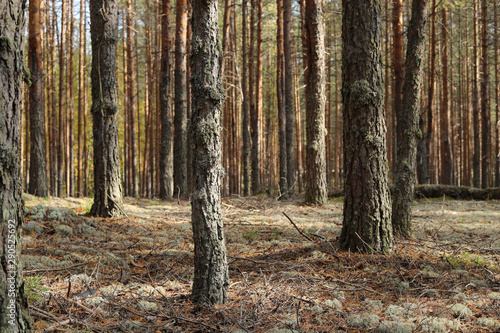 © Sergei Malkov, Obraz premium Pine forest in the fall. Rays of the sun illuminate trees and moss