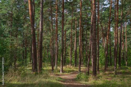Fototapeta premium Pine forest in the forest park zone (Upper Park) on the Baltic Sea coast on a sunny summer day, Sestroretsk, Kurortny District, Saint Petersburg, Russia