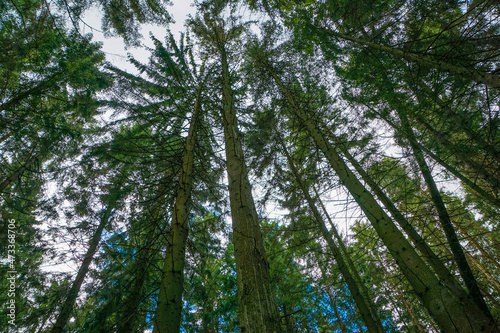 Obraz premium Pine forest in the morning, bottom-up view of the sky