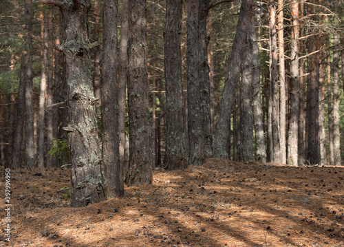 Obraz premium Pine forest in the sunny autumn day. Pine trees planted in a row.