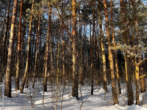 © Alex Alex, Obraz premium Pine forest in winter sunny day. Beautiful winter landscape with snow.