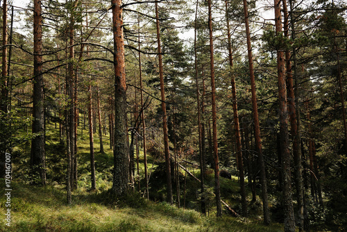 © Ekaterina, Obraz premium Pine forest landscape in Divcibare, Serbia with tall trees on a hillside