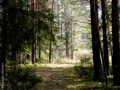 © 46boris48, Fototapeta premium Pine forest lit by the evening rays of the sun