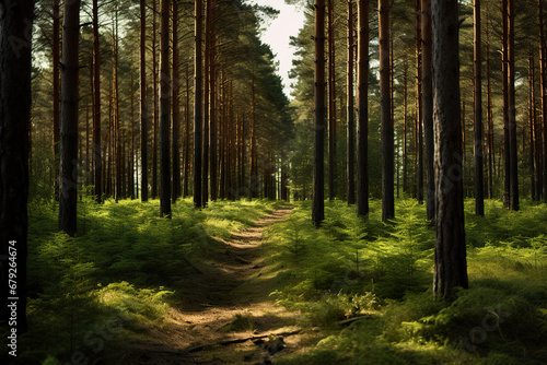 © Shades3d, Obraz premium Pine Forest Path. Generative Ai