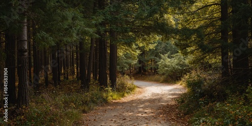 Fototapeta premium Pine forest pathway under canopy, ideal for outdoor recreation and trail...