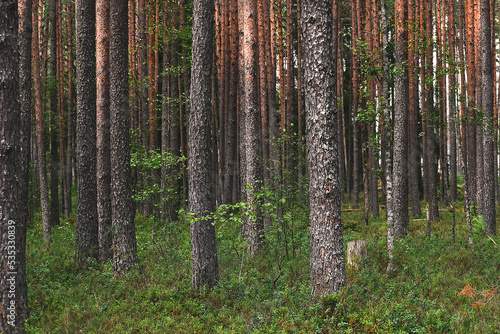 Obraz premium Pine forest. Strong brown tree trunks and small forest grass. Summer forest.