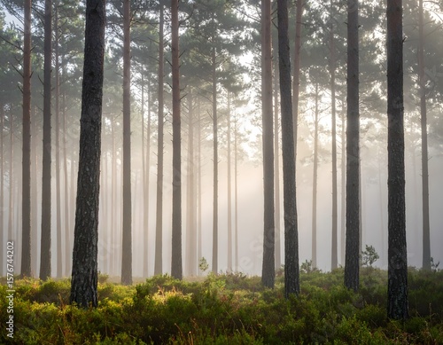 Obraz premium Pine Forest Sunlight Morning Scene