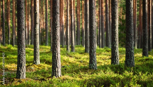 © lan, Obraz premium Pine forest, sunlight through trees