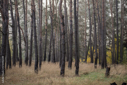 © APHOTOSTUDIO, Fototapeta premium Pine forest trees in cloudy weather.