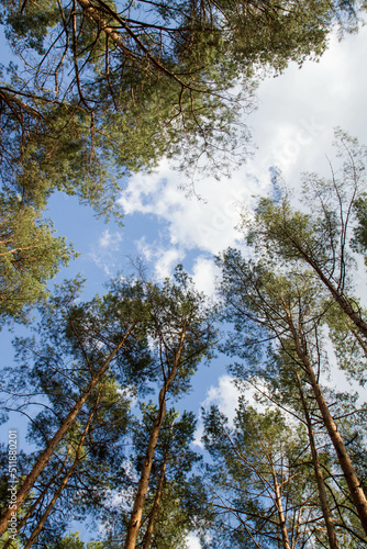 Obraz premium Pine forest - trees seen upwards against the sky