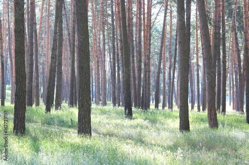 Obraz premium Pine forest with beautiful high pine trees in summer in sunny weather