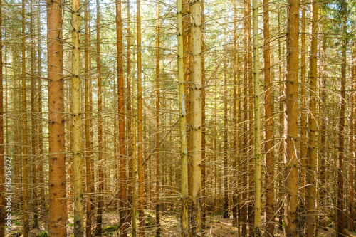 Obraz premium Pine forest with high trees in sunlight