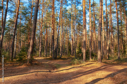 Obraz premium Pine forest with its paths in the fabulous rays of sunshine. Belarusian nature, spring.