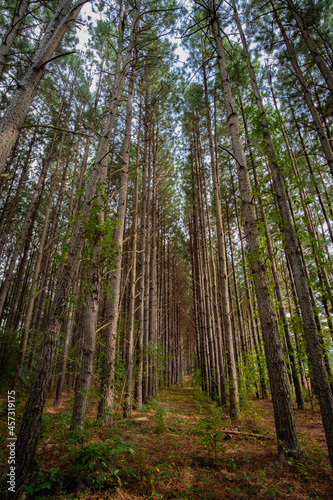 © Mark Castiglia, Obraz premium Pine forest with parallel trees. Stylized image. with crisp focus and dramatic contrast.