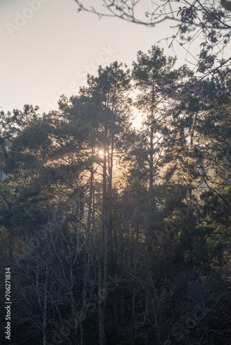 Obraz premium Pine forest with sunset twilight dawn sunlight.