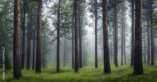 © Sagar, Fototapeta premium pine forest with tall trees, against the backdrop of a foggy, misty morning light
