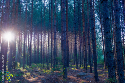 Obraz premium Pine grove at dawn.Sun ray