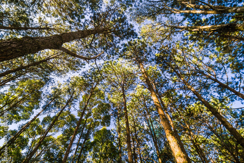 © themorningglory, Fototapeta premium Pine larch forest with sunlight blue sky